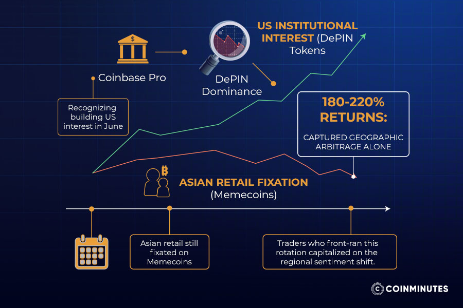 One way professionals operate involves positioning across regions based on shifting momentum. Instead of holding uniform views globally, they favor digital assets where local markets begin gaining traction - while taking offsetting positions where attention lags. During midyear, a signal emerged through increased activity tied to DePIN-related tokens on U.S. platforms such as Coinbase Pro. At that time, individual buyers in parts of Asia continued focusing on speculative trends unrelated to infrastructure themes. Those aware of the developing imbalance positioned ahead of broader awareness. Returns from this spatial misalignment ranged between 180% and 220%. Profit came simply from observing differing regional priorities at different times.