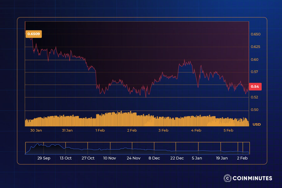 Exactly at $0.55 sits the Point of Control (POC), marking the most intense area of buying activity. From $0.62 to $0.68, volume drops sharply - this stretch tends to see swift price movement, given few traders are positioned above. Although located just ahead, EMA 20 at $0.62 acts as a barrier worth watching closely. Only once $0.62 begins holding as floor does any real shift emerge in near-term direction.