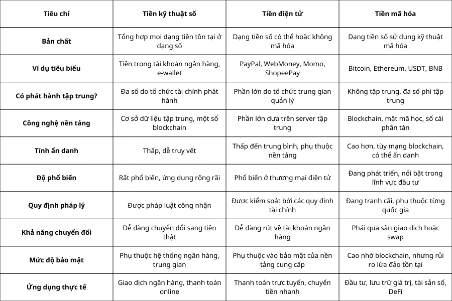 Những khái niệm liên quan đến tiền trong thế giới số hóa thường gây nhầm lẫn cho cả người mới và nhà đầu tư lâu năm. Để tránh sự nhập nhằng, việc phân biệt rõ giữa tiền kỹ thuật số, tiền điện tử và tiền mã hóa là điều cần thiết trước khi bước vào phân tích sâu hơn về bức tranh tài chính hiện đại. Bảng tổng hợp dưới đây sẽ giúp làm rõ các điểm giống và khác biệt giữa ba khái niệm này ở nhiều góc độ khác nhau: