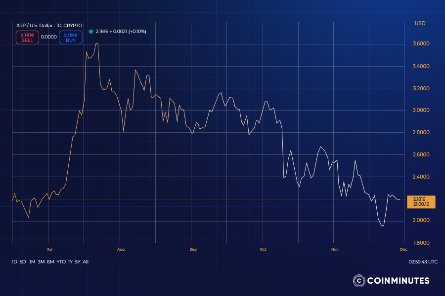 At the moment, XRP is holding strong at around $2.18. The visual representations of the price changes indicate a very quick recovery from the decrease. Those who wanted to sell their positions tried to depress the prices, but buyers came in with full force as if it was a Black Friday sale.